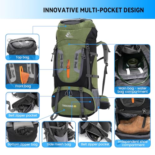 Specification: Bseash 80L Waterproof Hiking Camping Backpack with Rain Cover, Lightweight Outdoor Sport Travel Daypack for Climbing Touring (Army Green)