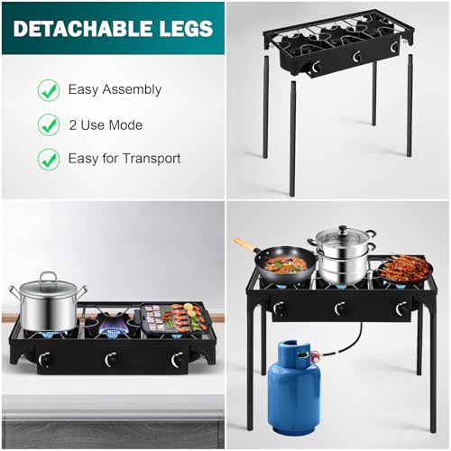 Specification: 3 Burner Gas Stove, 225,000BTU Outdoor Propane Stove with 0-20 PSI Adjustable Regulator and 4ft Hose, Propane Burners for Outdoor Cooking Patio Backyard Camping with Detachable Stand Legs