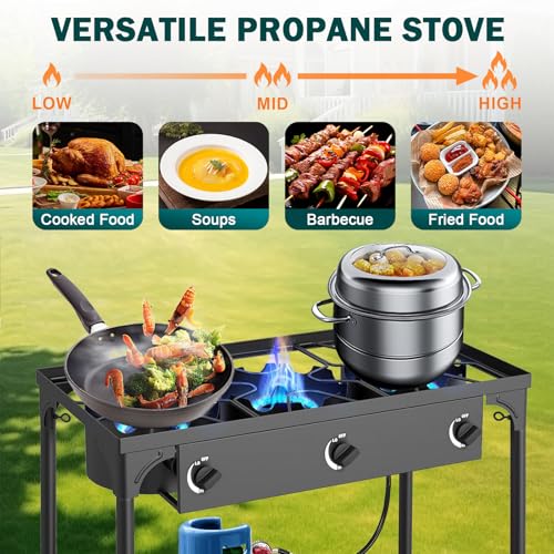 🔥 𝑮𝒓𝒆𝒂𝒕 𝑶𝒖𝒕𝒅𝒐𝒐𝒓 𝑪𝒐𝒐𝒌𝒊𝒏𝒈: With three powerful burners to work with, the outdoor propane gas stove simplifies camp cooking and keeps strong odors away from your home. Perfect for clean outdoor deep frying, outdoor cooking, camping, RV trips, and parties.