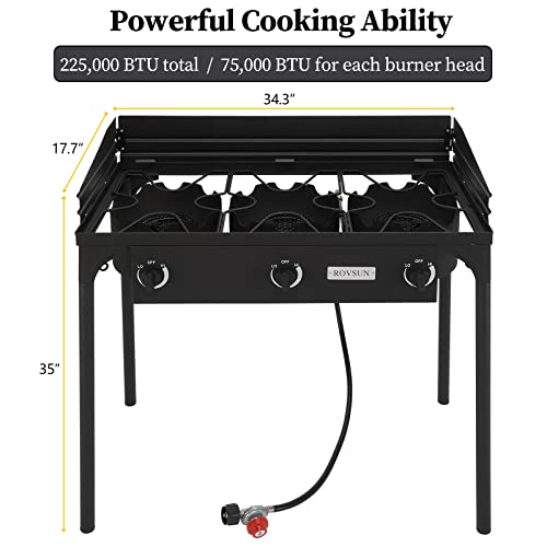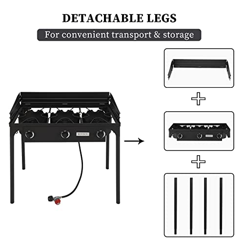 Specification: Bonnlo 3-Burner Outdoor Portable Propane Burner Stove 225,000-BTU Gas Cooker with Windscreen & Carrying Bag, Heavy Duty Iron Cast Patio Burner with Detachable Stand Legs for Camp Cooking