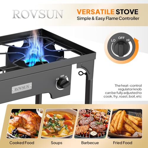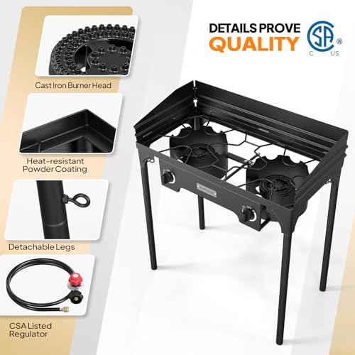 Specification: ROVSUN 2 Burner Outdoor Camping Stove with Wind Panel, 150,000 BTU Propane Burner, Gas Cooker with Detachable Legs & CSA Regulator for Home Camp Paito Cooking Frying Canning