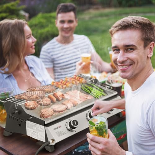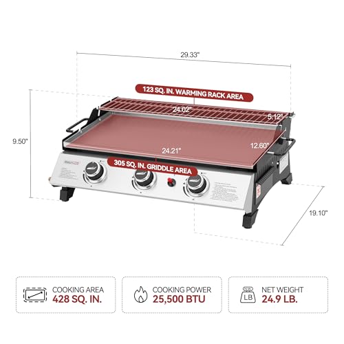 Specification: Royal Gourmet PD1303S 3-Burner Tabletop Propane Gas Griddle with Detachable Griddle Plate, 24-Inch Stainless Steel Portable Griddle with Warming Rack for Outdoor Cooking, Silver