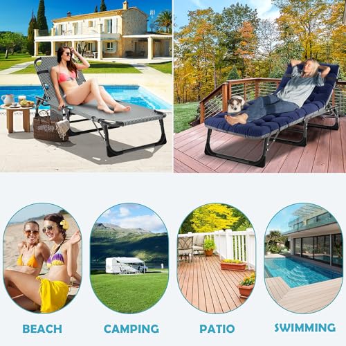 ABORON Heavy Duty Patio Chaise Lounge, 500LB Bearing 3IN1 Adjustable Lounge Chair 1200D Oxford Adults Sleeping Camp Chair, with Mattress (Chaise Lounge, Grey Bed & Blue pad)
