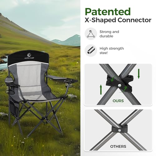 ALPHA CAMP Oversized Mesh Back Camping Folding Chair Heavy Duty Support 350 LBS Collapsible Steel Frame Quad Chair Padded Arm Chair with Cup Holder Portable for Outdoor (Black/Grey)