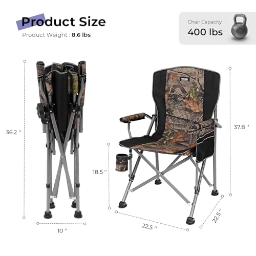 Specification: Camping Folding Chair, Heavy Duty Steel Frame Support 400 LBS with Side Pocket and Cup Holder, Portable for Camping, Fishing, Picnic,Camouflage