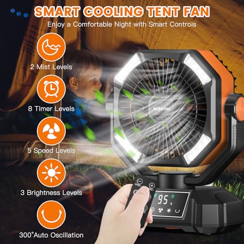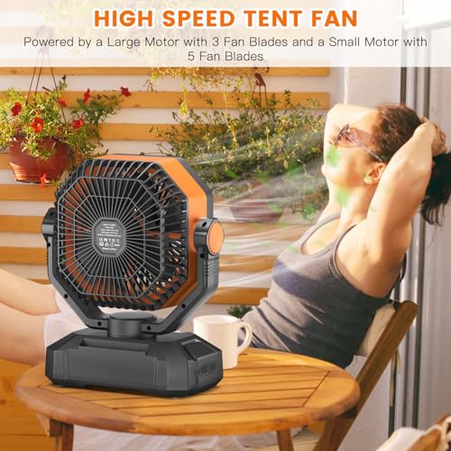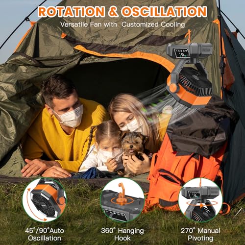 Camping Fan Rechargeable Battery Powered – 20,000mAh Portable Tent Fan with LED Lantern Light, Auto Oscillating Camp Fan with Remote, Dual High-Speed Motors & Dual Fans with 1H-8H Timer 5 Speeds (Orange) Stay cool during your outdoor adventures with this powerful, rechargeable camping fan. Powered by a 20,000mAh battery, it runs for 12-50 hours on a single charge, fully recharged in just 9-10 hours. Featuring a digital battery indicator, remote and button controls, you can easily adjust speed, light, oscillation, and timer settings (1-8 hours). The fan’s auto oscillation (45°/90°) and 270° manual vertical adjustment provide wide coverage for tents or any outdoor space. It offers five speeds, a stronger airflow with dual brushless motors, and a 360° rotating hook for hanging. The fan also includes three adjustable color temperatures for soft lighting or brighter illumination. Ideal for camping, this fan also features reverse charging capabilities to power other devices, making it a must-have camping essential.