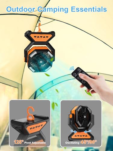 Specification: Rechargeable Fan Portable-Camping Fans for Tents, 20000mAh Battery Powered Camping Lights with Remote Hook, 4 Timer/4 Speed,Oscillating 45°/90°, Suitable for Personal Office Desk Travel Beach BBQ