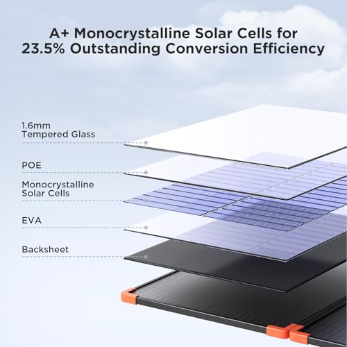 【Premium A+ Monocrystalline Cells for 23.5% High Efficiency】These portable solar panels use premium A+ grade monocrystalline cells, achieving a remarkable 23.5% conversion rate. This high efficiency maximizes power output even in low-light conditions, making it perfect for camping, RV trip, and power backup. Constructed with 1.6mm tempered glass, the solar panel 100w offer excellent impact resistance and long-lasting performance, retaining up to 80% of power output even after 25 years