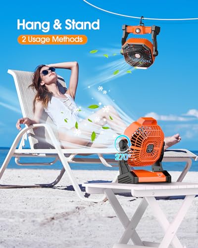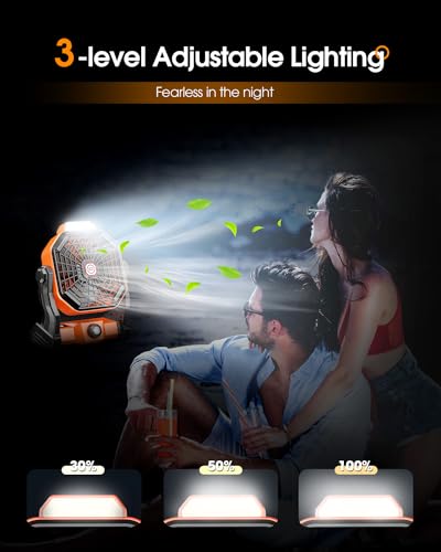 20000mAh Solar Camping Fan, 10W Solar Powered Fan & Led Lantern, Rechargeable Fan with Solar Panel, Battery Operated Powered Fan, Outdoor Tent Fan for Camping Essentials Accessories (Orange)