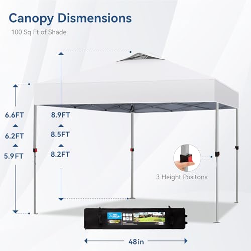 100 Square Feet of Shade:Assembled size is 10’x10′, height is adjustable to 3 positions, just hit the button on the leg to adjust,can be matched freely according to the scene size, big enough for about 10 people to sit under