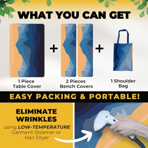 【WRINKLE FREE & WASHABLE】Fitted picnic table cover with bench covers is designed with all round elastic bands to make the polyester tablecloth fit tightly. The outdoor rectangle fitted table cloth is reusable, could easy wipe out stains by sponge. It is better to wash by hand, do not do bleach or iron