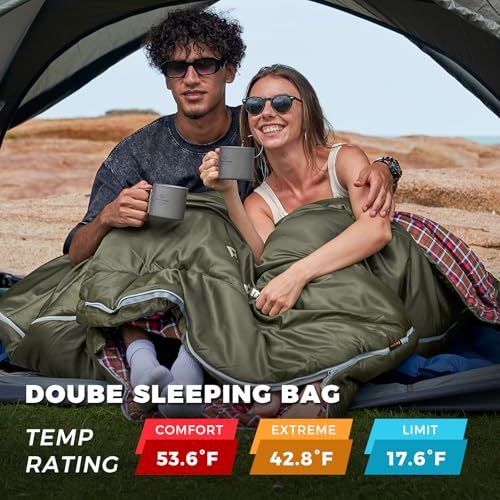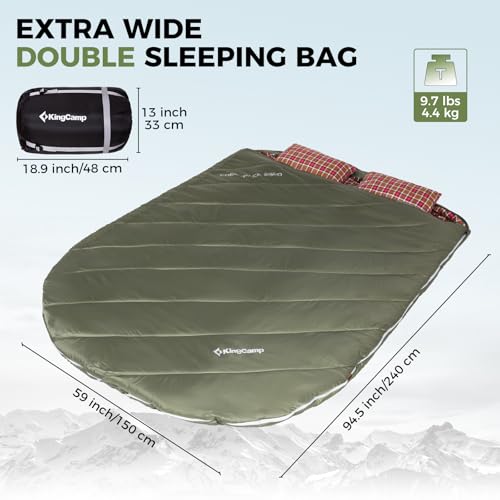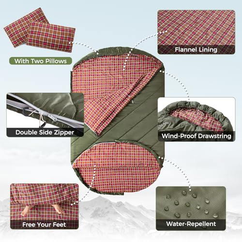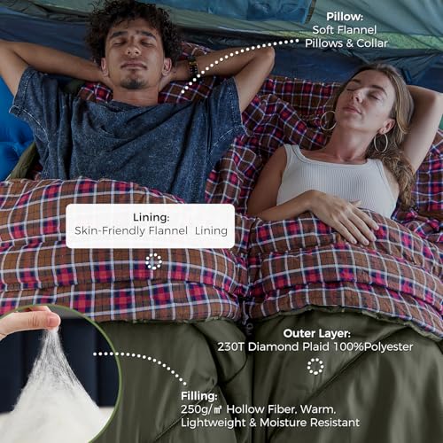 KingCamp Double Sleeping Bag with Pillows for Couples & Family, Queen Size Flannel Sleeping Bag for Camping Hiking and Outdoors