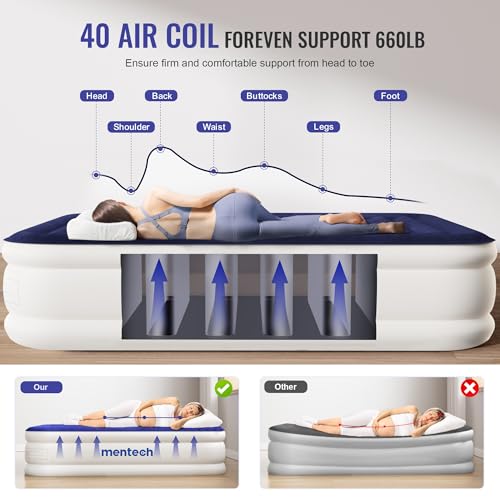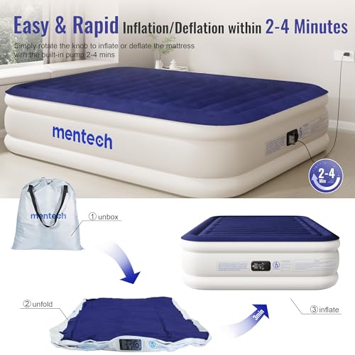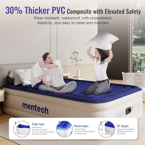 【Enhanced Durability and Stability】 Crafted from 0.4mm thick composite PVC, this air mattress is 30% thicker for offering enhanced durability, waterproofing, and puncture resistance. Plus, all Mentech blow up mattress come with a repair kit for easy fixes in case of accidental punctures or tears, keeping your air bed ready for any adventure