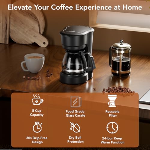 Space Saving Compact Design — Perfect for a small kitchen or office, this 5-cup drip coffee machine brews just the right amount of coffee for 1-2 people, delivering fresh, hot coffee
