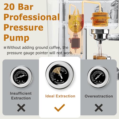 [20bar Pressure Pump & Milk Frother] – The 20bar professional pressure pump, built-in pressure gauge shows the exact pressure and make milk foam in a short time. The stainless steel frothing wand can rotate 360 ° to create rich creamy froth and different latte art.