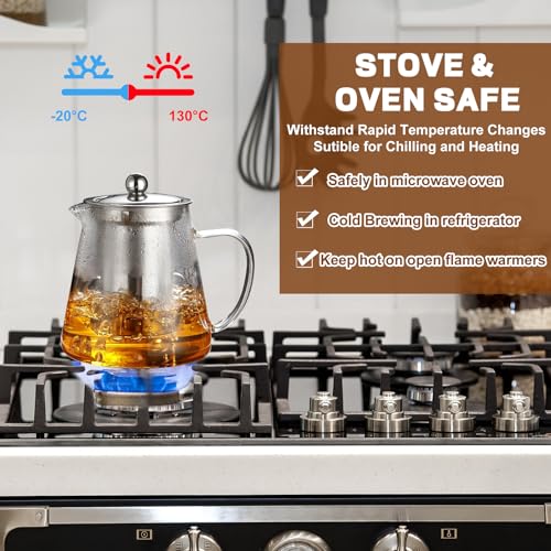 Removable Infuser: This tea kettle has a removable infuser, which made with food grade 304 stainless steel, You can use this glass tea pot to brew loose leaf tea, tea bags, blooming camellia, fruit tea, herbal tea.