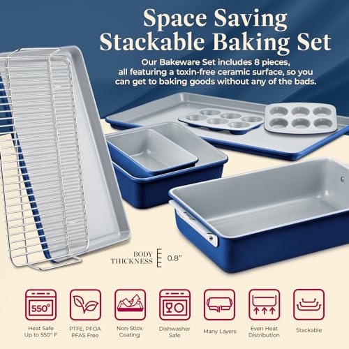 Healthy Baking Made Simple: Experience guilt-free baking with our 8-piece stackable bakeware set, featuring a ceramic non-stick coating that’s free of PFOA, PFAS, and PTFE for a healthier cooking option.
