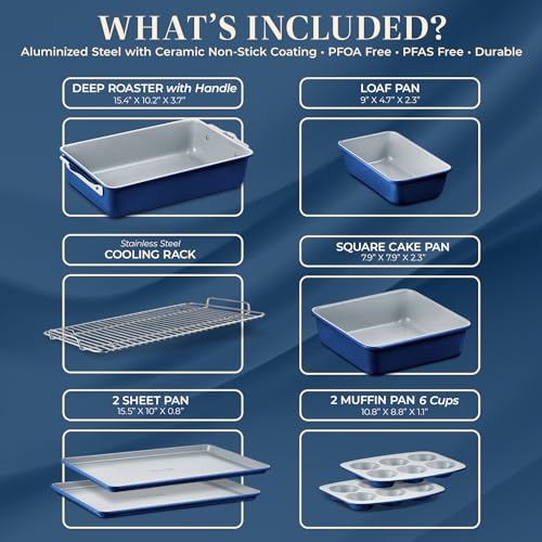 Complete Baking Solution: The set features a stainless steel cooling rack, sheet pans, a muffin pan, a loaf pan, a square cake pan, and a deep roaster with a handle, offering everything you need for diverse baking tasks.