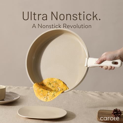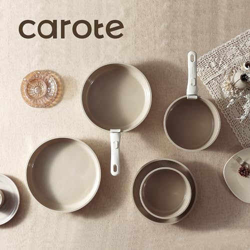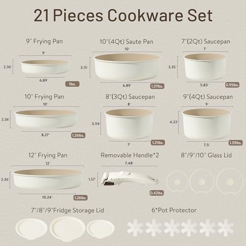 Specification: CAROTE 21pcs Detachable Handle Pots and Pan Set, Ceramic Nonstick Induction Cookware, Removable Handle, RV Oven Safe Cookware, Beige