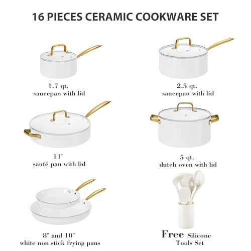 Ceramic Cookware Set, VONIKI 16 Pcs Pots and Pans Set Non Stick, Kitchen Cookware Sets with Cooking Utensils Set, Non Toxic Cookware Set White Gold Pan Set for Cooking Pot Oven & Dishwasher Safe, Gift