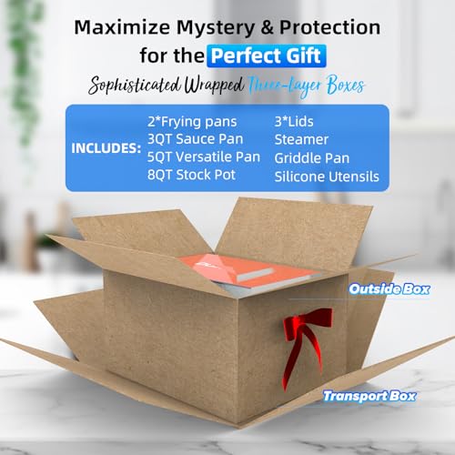 Complete Kitchen in a Box: This kitchen cookware set provides everything you need to cook like a pro right out of the box. The set includes an 8-inch frying pan, 10-inch frying pan, 10-inch round grill pan, 3-qt saucepan with glass lid, 5-qt everyday pan with glass lid, 8-qt stockpot with glass lid, steamer, silicone ladle spoon, mixing spoon, pasta fork, and turner. Enjoy the convenience and versatility of having a complete set of cookware at your disposal.
