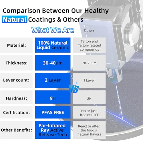 9H Diamond-Level Enhanced Coating: The coating achieves 9H hardness, ensuring exceptional resistance to wear, corrosion, and acids. Please note that our ceramic coating serves as an alternative to Tef*l*on. While it’s equipped with ultra non stick feature, it’s not *chemically* nonstick.
