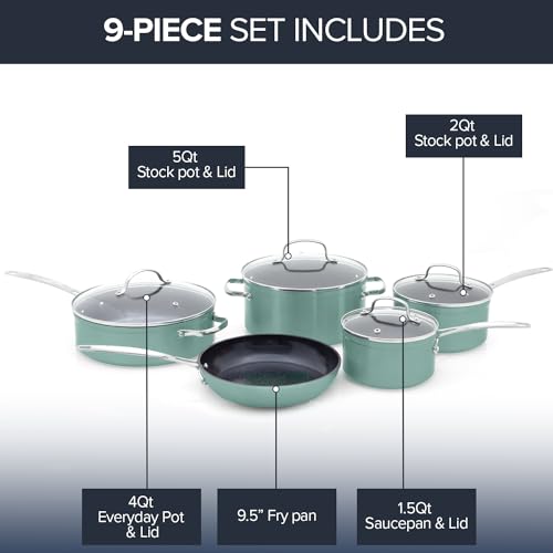 Nuwave Healthy Duralon Blue Ceramic Nonstick Coated 9pc Cookware Set, Scratch-Resistant Diamond Infused, PFAS Free, Induction Ready & Evenly Heats, Oven Safe, Tempered Glass Lids