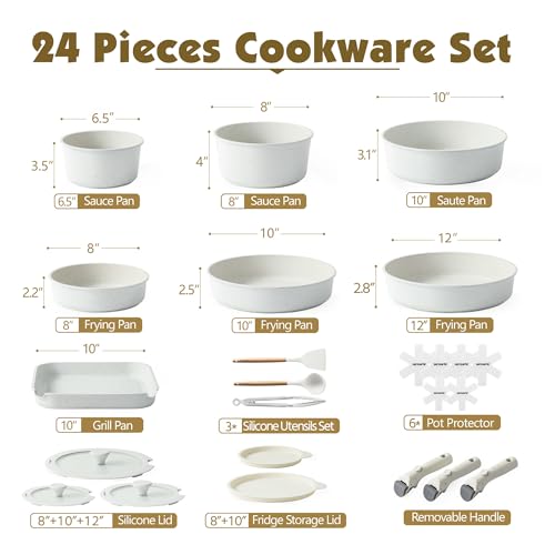 Specification: SENSARTE 24 Piece Pots and Pans Set, Nonstick Detachable Handle Cookware, Induction Kitchen Cookware Set with Removable Handle, Healthy Non Stick RV Cookware, Dishwasher & Oven Safe, PFOA Free (White)