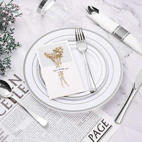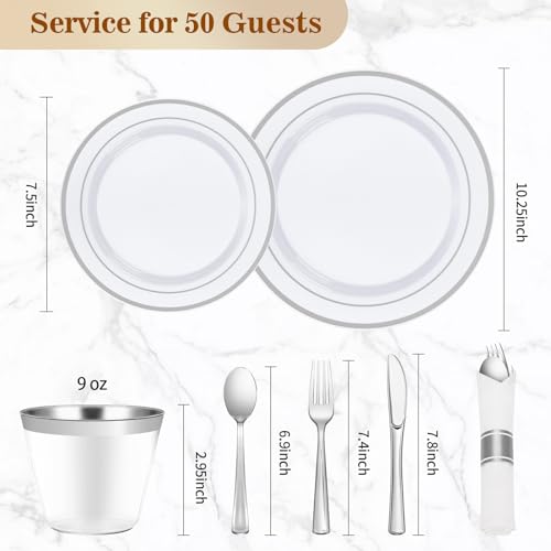 350PCS Silver Plastic Dinnerware Set, Disposable Party Plates for 50 Guests, Include: 100 Plastic Plates, 50 Pre Rolled Napkins with Silver Silverware, 50 Cups