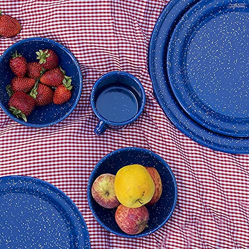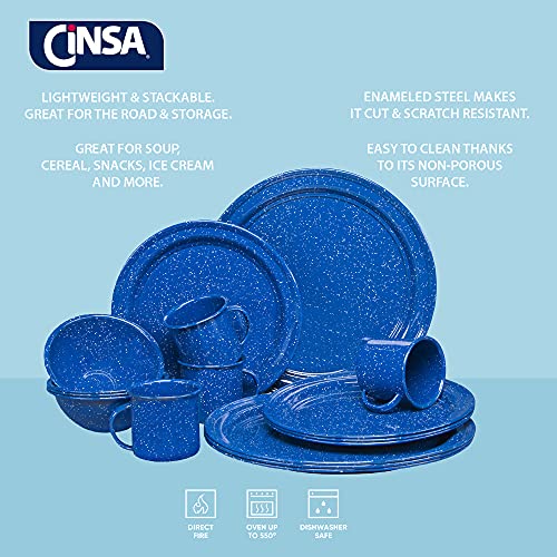 Specification: Cinsa 16 Piece. Enameled Dinnerware Camping/Outdoor Set for 4. Includes Plates, Bowls, Mugs, Coffee Boiler