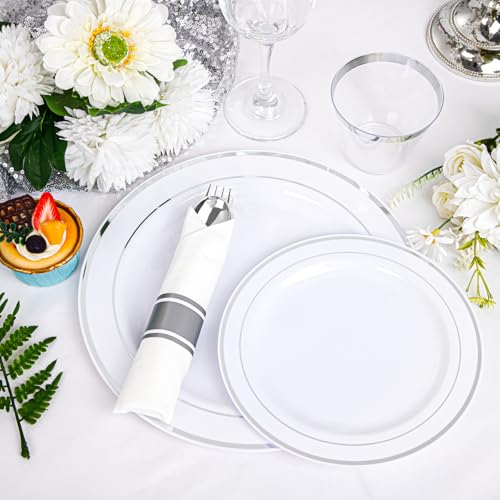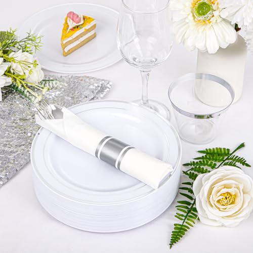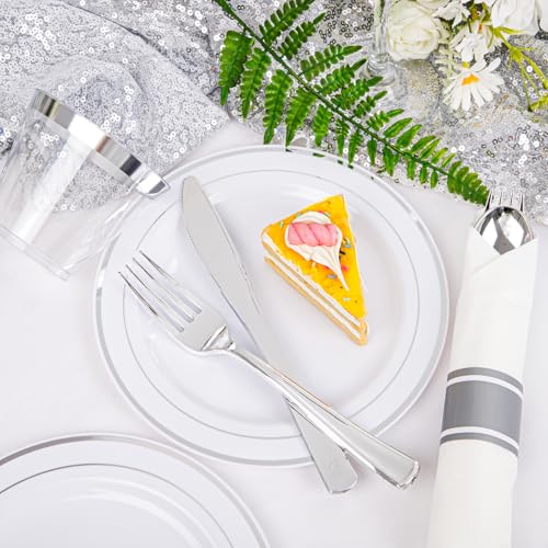WHAT YOU GET:700pcs silver plastic plates for 100 guests. Include: 100 Dinner Plates, 100 Dessert Plates, 100 Pre – Rolled Napkins with Silver Silverware, 100 Cups. It is great Plates and Napkins Party Supplies.