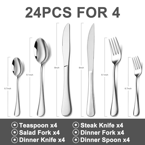 Specification: 24PCS Silverware Set, Stainless Steel Flatware Set for 4, Food-Grade Tableware Cutlery Set, Steak Knife Fork Spoon Sets for Home Kitchen, Mirror Polished Utensil Sets Dishwasher Safe