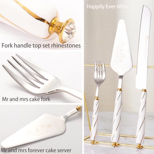 Exquisite Design: This wedding cake cutting set is great for wedding gifts, bridal shower gifts engagement gifts, anniversary gifts, birthdays and housewarming. The wedding cake knife and server set are engraved with “Mr & Mrs Forever” and “happily ever after”, while the forks are engraved with “Mr” and “Mrs”. Let this wedding knife and cake service set commemorate your special day.