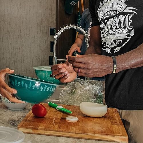 Camco’s Bamboo Cutting Board with Counter Edge is perfect for cutting vegetables, fruits, meats and cheese. The built-in counter edge helps keep the board flush with the countertop to hold it steady and a built-in juice groove reduces mess. This product is constructed of durable bamboo that is easy to maintain. Bamboo is easier on knife blades, helping to keep them sharper longer. Product measures 18-inches (L) x 14-inches (W) x 1 ¾-inch (H).