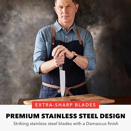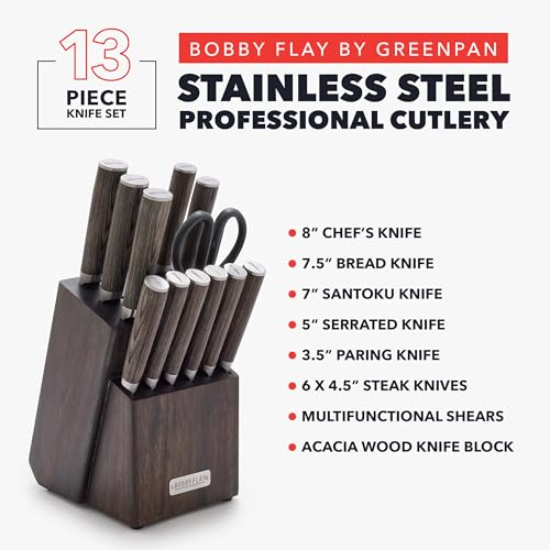 Specification: GreenPan x Bobby Flay 13 Piece Knife Block Set, Sharp Stainless Steel Blades, Hand Finished Wood Handles, Acacia Wood Block, Premium Cutlery with Damascus Style Design