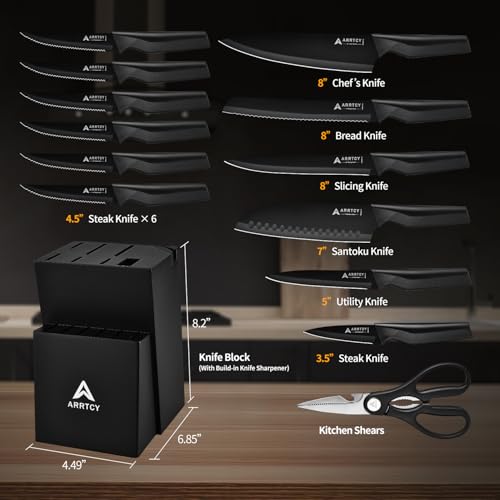 Slice, dice, chop, and mince with ease: Kitchen knife Set includes an 8″ chef’s knife, 8″ bread knife, 8″ slicing knife, 7″ santoku knife, 5″ utility knife, 3.5″ paring knife, 6 steak knives with 4.5″ serrated blades, kitchen scissors, and a hardwood knife block with built-in sharpener. A complete set of knives to meet all your culinary needs.