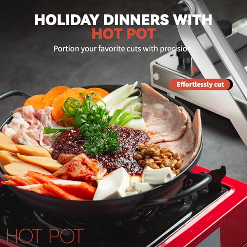 Time-Saving Design: Say goodbye to tedious slicing methods. With our frozen meat slicer, you can save valuable time in the kitchen. Allow you to focus on creating mouthwatering dishes and quickly slice frozen beef, meat, lamb, ham and vegetables to make hot pot, sandwiches, pizza or appetizers. It is also suitable for Korean BBQ, sukiyaki, shabu shabu, etc.