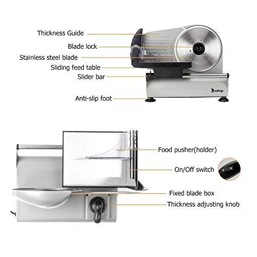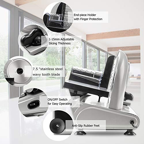 Specification: Winado Meat Slicer, 7.5 inch Electric Food Slicer, 150W Frozen Meat Deli Slicer, Premium Stainless Steel Blade & 0-15mm Thickness Adjustable Semi-Auto Meat Slicer For Commercial and Home, Silver
