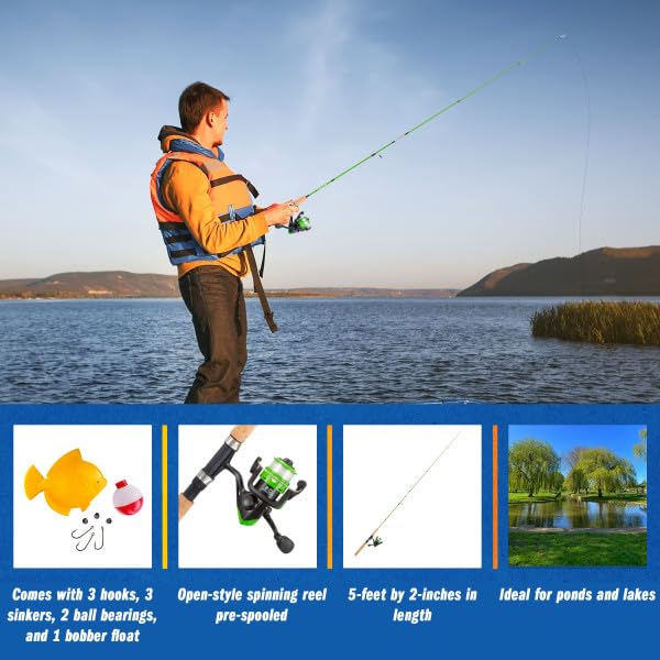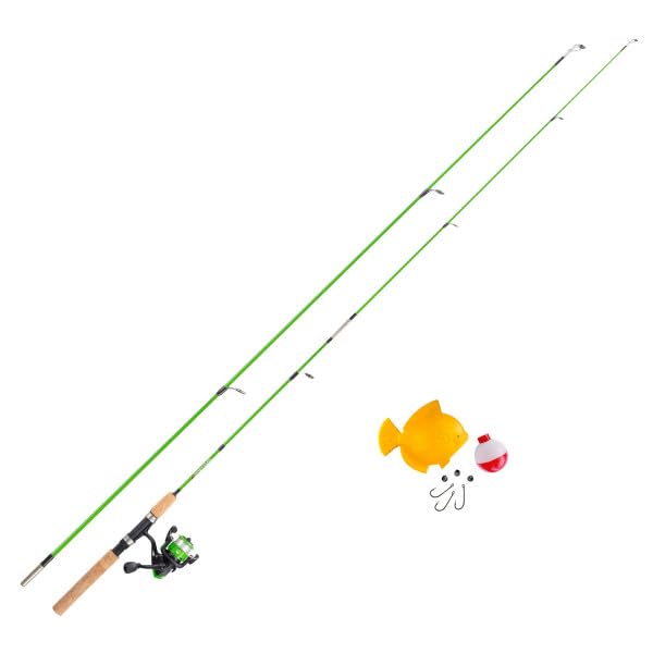 PRODUCT DETAILS – Materials: Fiberglass, Metal, Cork, and Plastic. Rod Dimensions: (L) 5′ 2″. Includes: Rod with 5.2:1 Gear Ratio 2000 Reel with 185yds of 10lb Monofilament Line, 3 Hooks, 3 Sinkers, 2 Ball Bearings, and 1 Bobber Float. Color: Green.