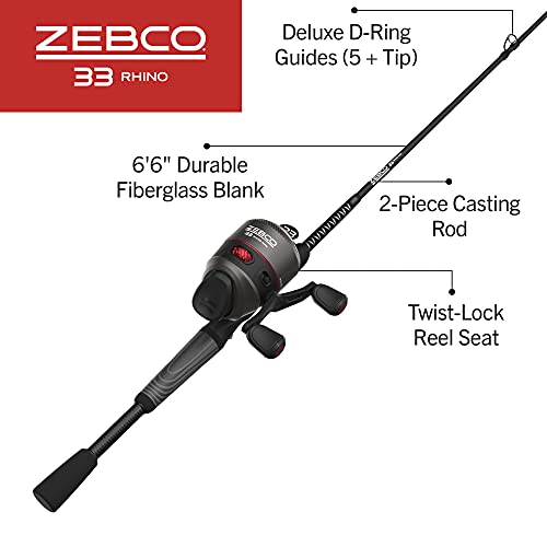Specification: Zebco 33 Rhino Tough Spincast Reel and 2-Piece Fishing Rod Combo, Durable E-Glass Rod with ComfortGrip Handle, Quickset Anti-Reverse Fishing Reel with Bite Alert