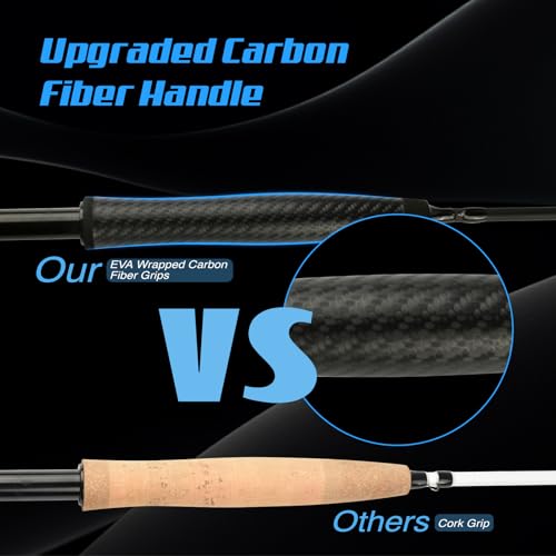 Upgraded EVA wrapped carbon handle fly fishing rod, fly rod body is made of pure IM8 30T carbon fiber for good durable and extra light weight. The EVA carbon handle of provides excellent cushioning and shock absorption, is more resistant to moisture and corrosion, and is lightweight to use and helps with casting. This fly fishing rod is designed to meet the needs of novice fly fishermen