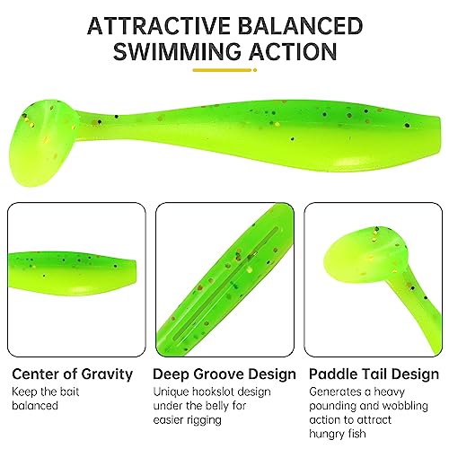 【HIGH-QUALITY MATERIAL】Made of premium quality soft plastic material, these paddle tail swimbaits are resilient and durable,and not easy to deform. Fishing soft plastic lures is not easy to break and can be reused.