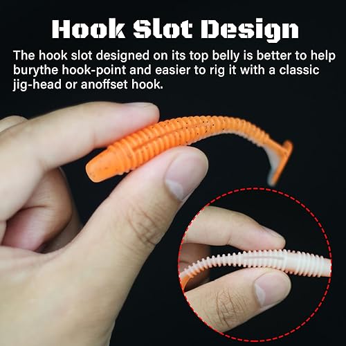 Hook Slots Design: The hook slot designed on its top belly is better to help burythe hook-point and easier to rig it with a classic jig-head or anoffset hook. Double hook groove design helps to bury hook point and avoid obstacles.
