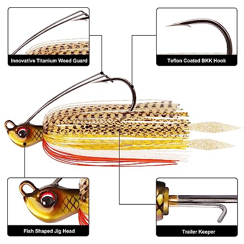 ULTRA-SHARP BKK HOOK – The bass lures are rigged with BKK ultra-sharp hook with Teflon super-smooth coating, which have excellent anti-rust performance, sharp hook point and strong penetration. The hook of the swim jigs feature low stabbing resistance and fast speed that is especially important for bass fishing.