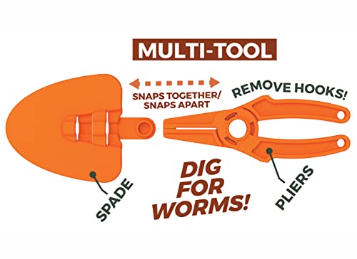 MULTI-TOOL: Includes functional, quick detach spade and plier multi-tool for digging for bait, removing hooks, opening/closing reusable split shot weights, etc.