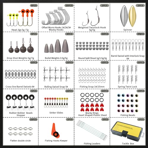 【Amazing Fishing Gear kit】GOTOUR fishing tackle box kit collects accessories set for any angler, including Jigs Head, Fishing Hooks, Fishing Weight & Sinkers, Fishing Snap & Swivels, Sinker Slides, Fishing Spinner, Fishing Beads, Fishing Rings, Fishing Leaders, Rubber Bobber Beads Stopper. The versatile fishing tackle kits have everything tools you need to catch a variety of fish in any season and in any way.