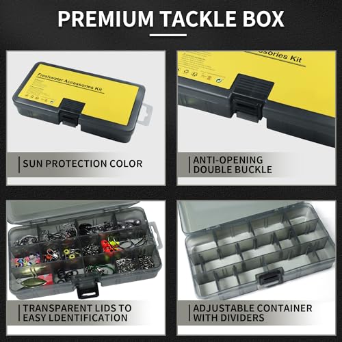 【Durable Tackle Box】The fishing tackle kit has anti-collision strips and a secure double-lock latch to protect your box. The one-touch open button makes it easier to manage the accessories inside. Removable dividers allow for more flexibility in the allocation of compartment sizes. Waterproof with a rubber seal to keep your accessory out of the water, and it can float in the water without worrying about losing your box.