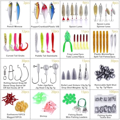 【Variety of Lures Combination】- The 302 pieces fishing baits set comes with everything you need: 1pcs Crankbait, 1pcs Popper, 1pcs Pencil, 1pcs Minnow, 1pcs VIB, 1pcs Frog, 2pcs Split Tail Fishes, 10pcs Spinner Lures, 59pcs Soft Worms, 20pcs soft plastic shrimp, 30pcs split shots, 10pcs offset hooks, 15pcs Jigs, 5pcs drop shot weights, 10pcs fishing sinkers, 5pcs fishing Leaders, 100pcs hooks with box and more fishing gear, reliable and all-around choice for any angler and fishing enthusiast.