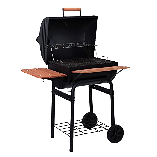 Specification: Char-Griller® Wrangler® Charcoal Grill in Black with Wood Shelves, EasyDump™ Ash Pan, Premium Wood Front and Side Shelves with Utensil Hooks, 635 Cooking Square Inches in Black, Model E2123