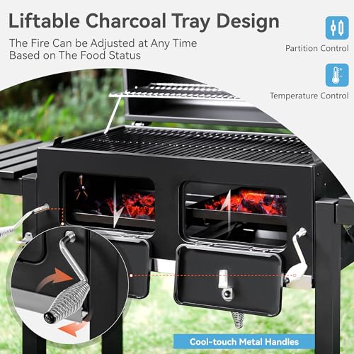 EASY ADJUSTABLE CHARCOAL PANS: 2 Individual height-adjustable charcoal pans. It’s easy to adjust the height of the charcoal pan by just rotating the crank handle of this barbecue grill. With our height-adjustable charcoal pan, you can easily control the distance between charcoal and food for better heat control. Hold up to 12lb coal